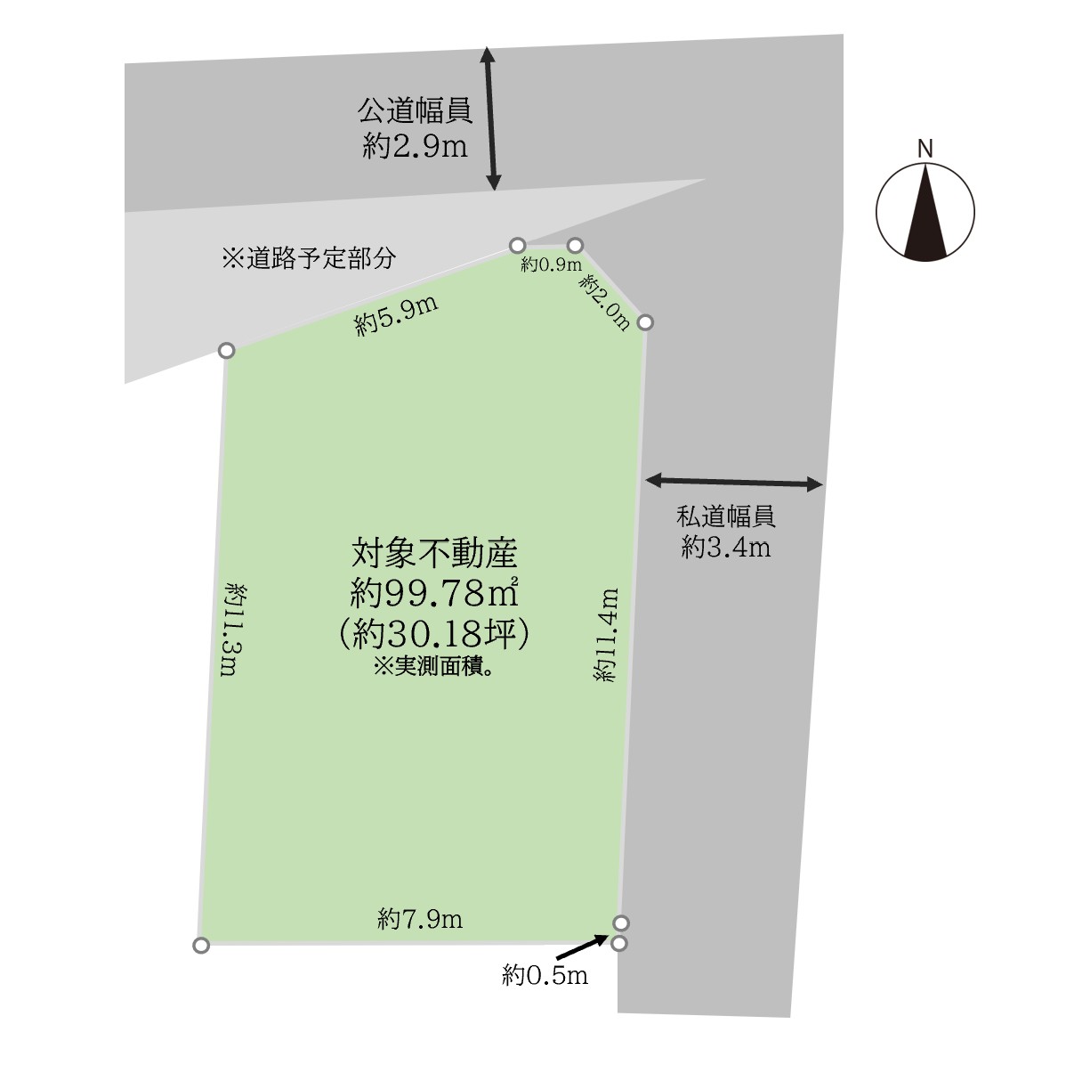 北側、公道、約2.9m 東側、私道、約3.4m |