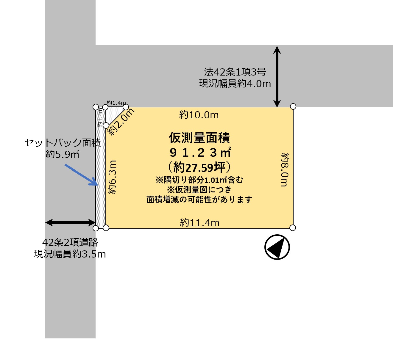 | 接面道路 | 接面道路 北西 約4m・私道 南西 約3.5m・私道 接道間口 北西 約12.2m 南西 約7.7m |