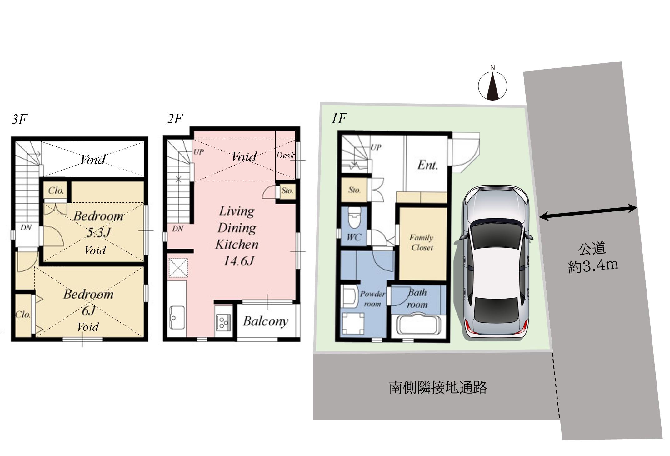 東側、公道、約3.4m |