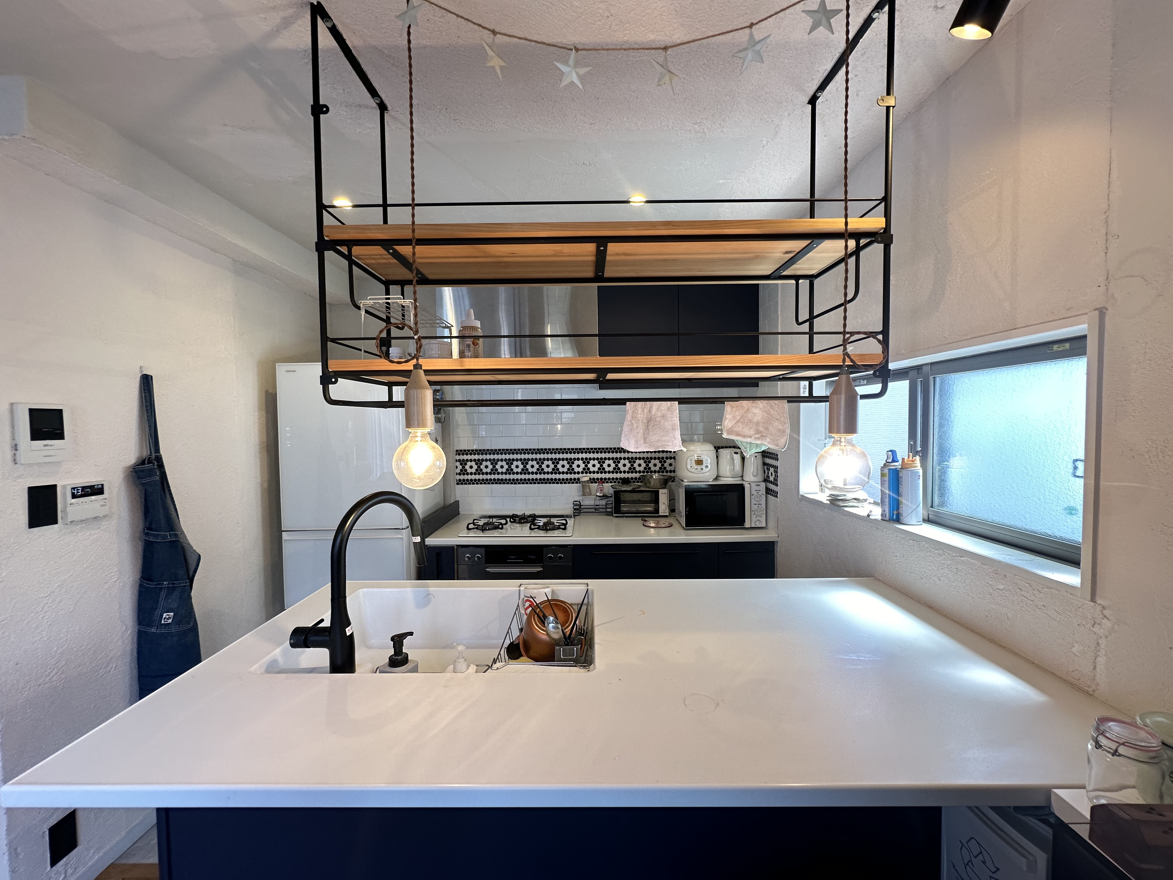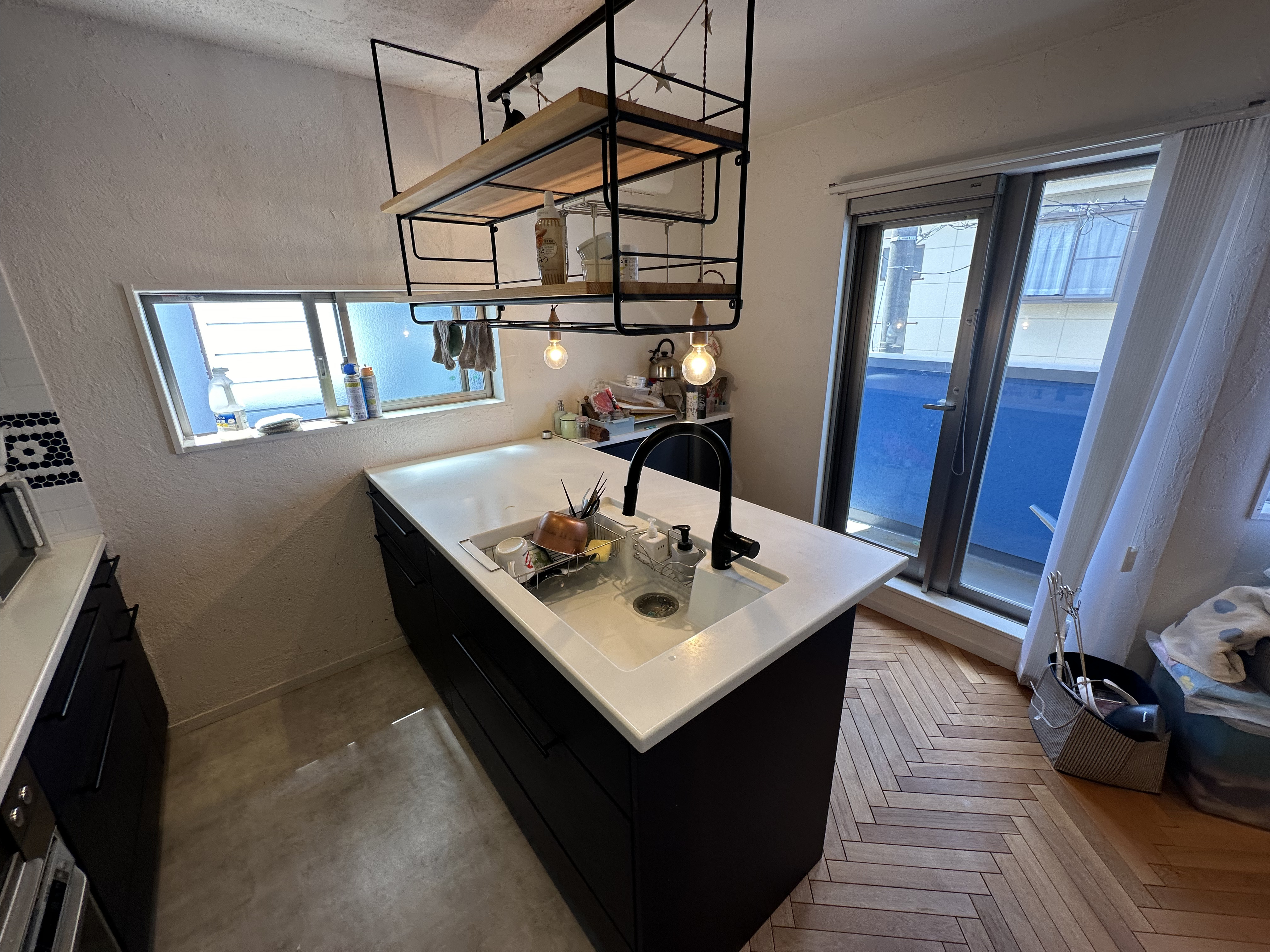 ◎無垢材を使用したフローリング人造大理石トップのシステムキッチン
