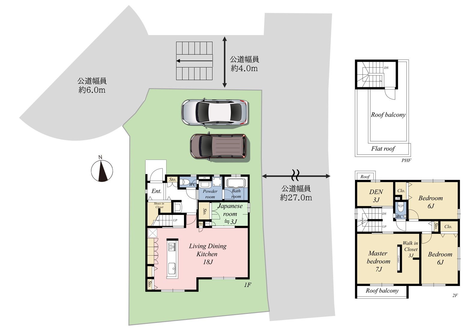 北側、公道、約4.0m 東側、公道、約27.0m 北西側、公道、約6.0m |