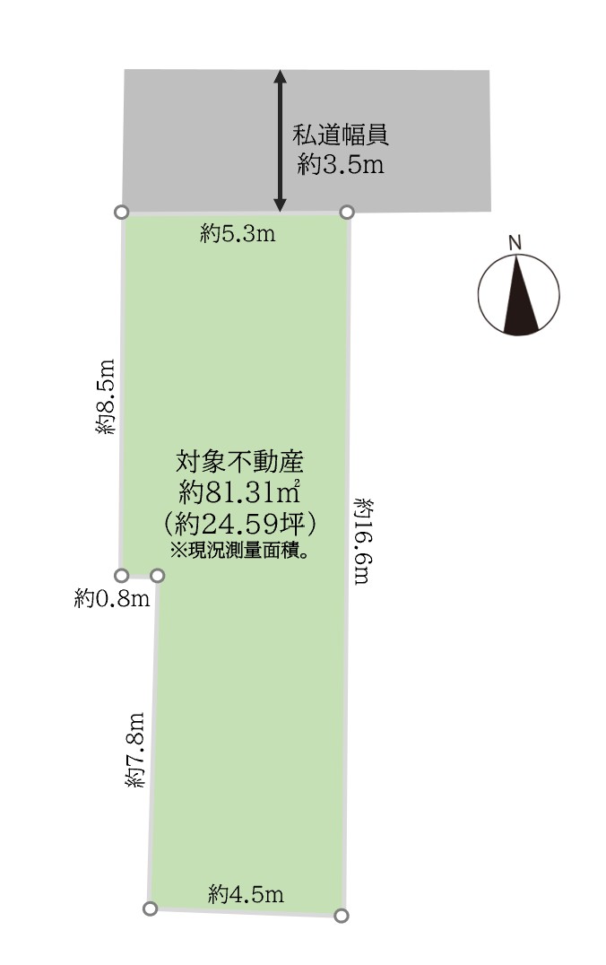 北側、私道、約3.5m |